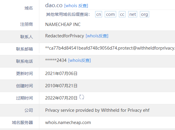 查詢whois發現,域名DAO.co注冊于2010年7月,距今已有12年的歷史,從中文含義來看,其有““到、道、刀”的意思,域名還是區塊鏈里面的一個專業術語“去中心化自治組織”(Decentralized Autonomous Organization)的縮寫。.co是哥倫比亞共和國的國家頂級域名,擁有“Corporation、Company"(商業公司)”等含義,因此易獲得終端和投資人的青睞和認可。